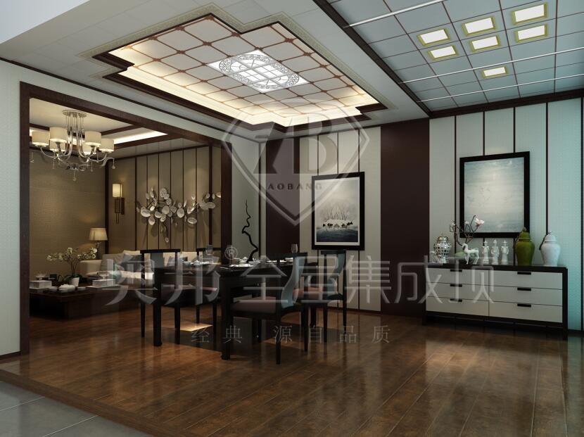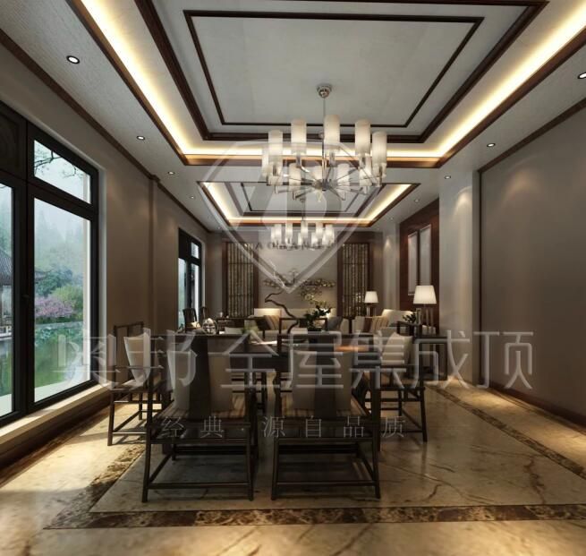 典雅的吊燈如盛開的花,優雅、精美,與墻面上獨特裝飾的圖案相互呼應,沉雅貴氣的沙發為整個空間帶來一絲穩重,巧妙擺設的植物深邃地將綠意安放其中,只待你駐留。整齊的茶具和深色的木質家具將主人的品位與檔次整體提升。