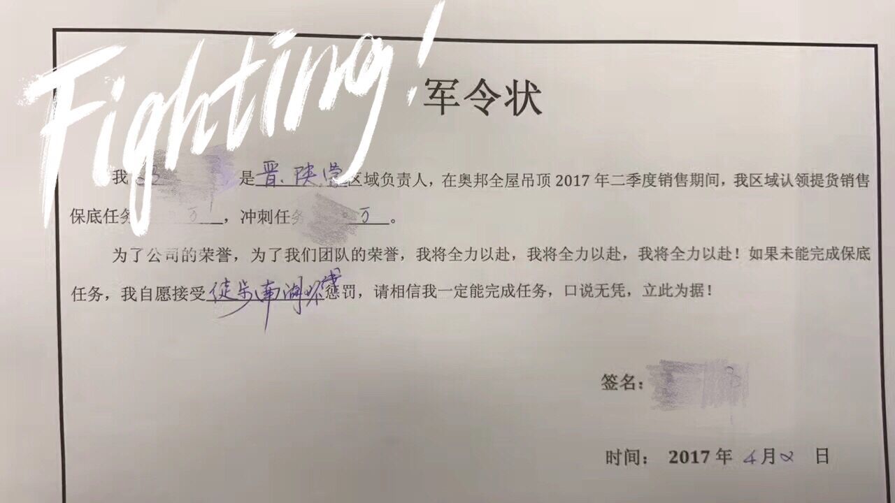 一直以來,奧邦銷售人員深入各省各市,向各地的經(jīng)銷商推廣我們的品牌,闡述我們的理念,介紹我們的產(chǎn)品風格——他們的努力換來的是超額完成了我們的銷售目標。品牌不僅僅需要銷售業(yè)績,新客戶的開發(fā)也尤為重要,而在第二季度,奧邦的新客戶開發(fā)目標也十分明確。會上,各位銷售精英激昂地爭做優(yōu)秀營銷者,更是現(xiàn)場立下“軍令狀”,誓要為榮譽而戰(zhàn)!讓我們拭目以待,相信他們定不會辜負公司的期待!