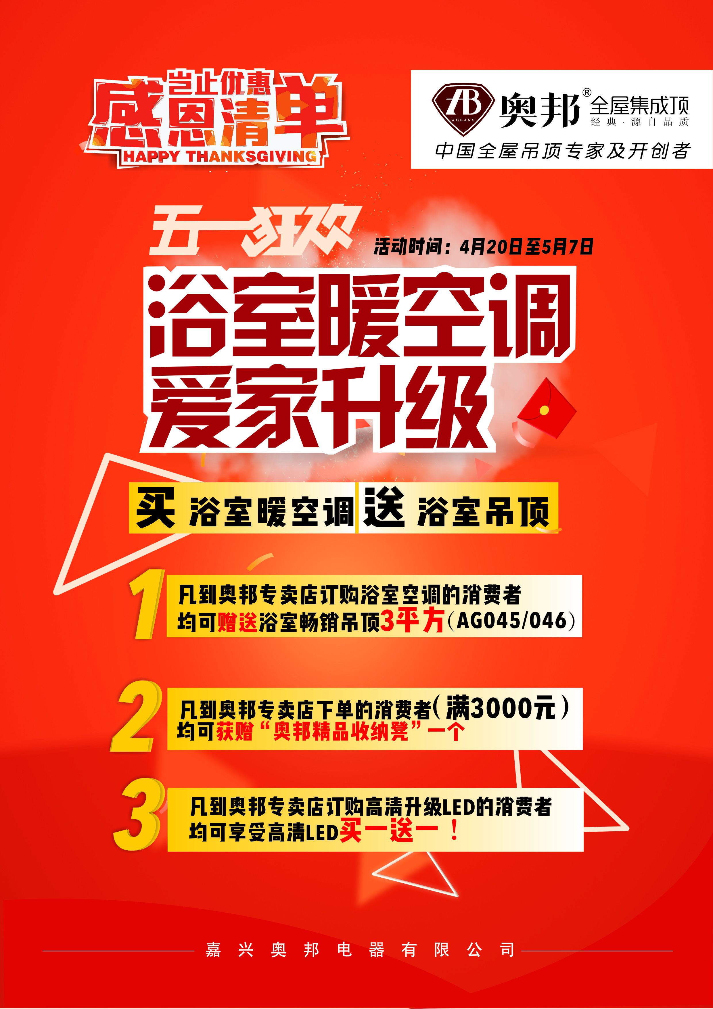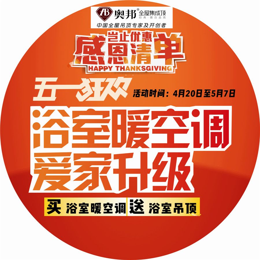五月是勞動人民的節(jié)日,奧邦全屋集成頂從4月20日到5月7日推出“五一狂歡”活動。一、凡到奧邦專賣店訂購浴室空調(diào)的消費者均可贈送浴室暢銷吊頂3平方(AG045/046) 二、凡到奧邦專賣店下單的消費者(滿3000元)均可獲贈奧邦精品收納凳一個 三、凡到奧邦專賣店訂購高清升級LED的消費者均可享受高清LED買一送一! 如有不明請咨詢奧邦專賣店客服人員。奧邦全屋集成頂保留對此次活動的最終解釋權